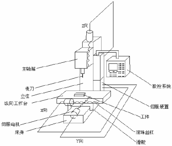 數(shù)控銑床又稱為CNC(Computer Numerical Control)銑床,即計(jì)算機(jī)數(shù)字控制銑床,其基本原理如圖所示。數(shù)控銑床可以根據(jù)零件形狀、尺寸、精度和表面粗糙度等技術(shù)要求制定加工工藝,選擇加工參數(shù),通過手工編程或利用CAM軟件自動(dòng)編程,將編好的加工程序輸入到控制器??刂破鲗?duì)加工程序處理后,向伺服裝置傳送指令。伺服裝置向伺服電機(jī)發(fā)出控制信號(hào)。主軸電機(jī)使刀具旋轉(zhuǎn),X、Y和Z向的伺服電機(jī)控制刀具和工件按一定的軌跡相對(duì)運(yùn)動(dòng),并加以一系列的輔助動(dòng)作,從而實(shí)現(xiàn)零件的輪廓、型腔、鉆孔、攻絲等工序的加工。