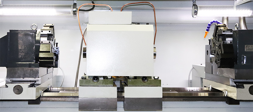 雙頭數(shù)控車床(DOUBLE-FACING CNC LATHE)又稱數(shù)控雙頭車床、雙頭車床,是由床身、進口液壓雙向主軸夾頭座、雙滑板工作臺和雙通道數(shù)控系統(tǒng)等組成。 對于兩端同軸度要求較高的較長棒料或管類零件,用普通車床或數(shù)控車床來加工難以保證其質(zhì)量。為此,我廠專門開發(fā)了雙頭數(shù)控車床。其加工最大直徑可達150mm,最大加工長度可依件長度要求來設(shè)計。